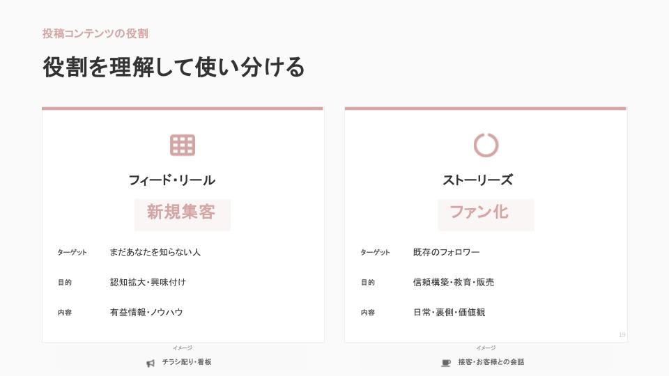 また、フィードやストーリーズで何を投稿していいかわからず手が止まってしまう方は多いです。投稿を以下の3つの役割で考えると、ネタ切れしにくくなります。
