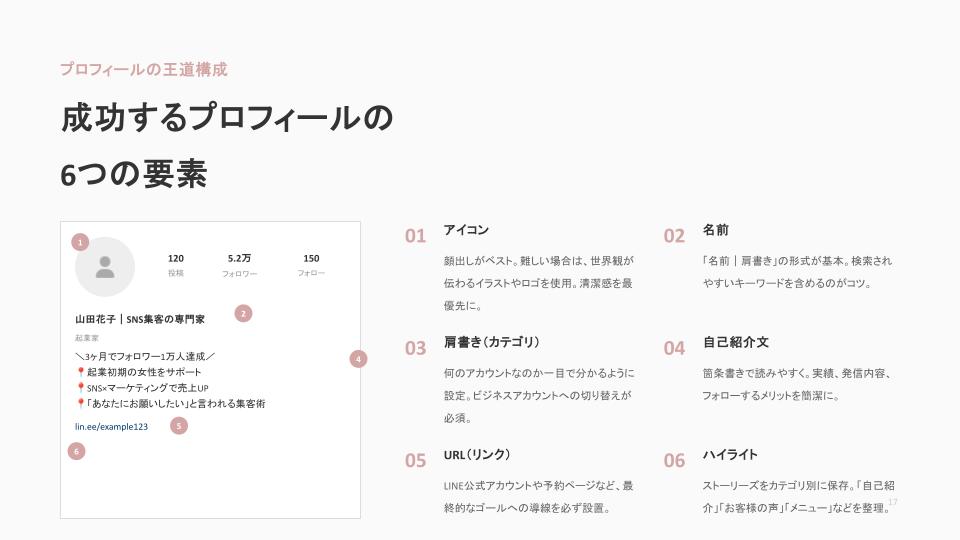 プロフィールページは、あなたのビジネスの「ランディングページ」です。初見の人が5秒で「フォローしよう」「問い合わせしよう」と思えるかどうかが勝負。以下の3点を必ず整えましょう。